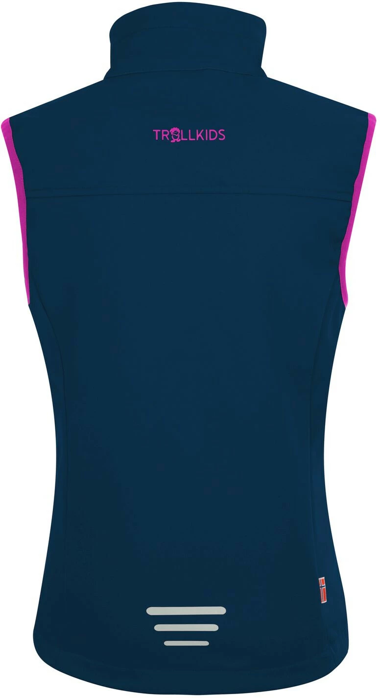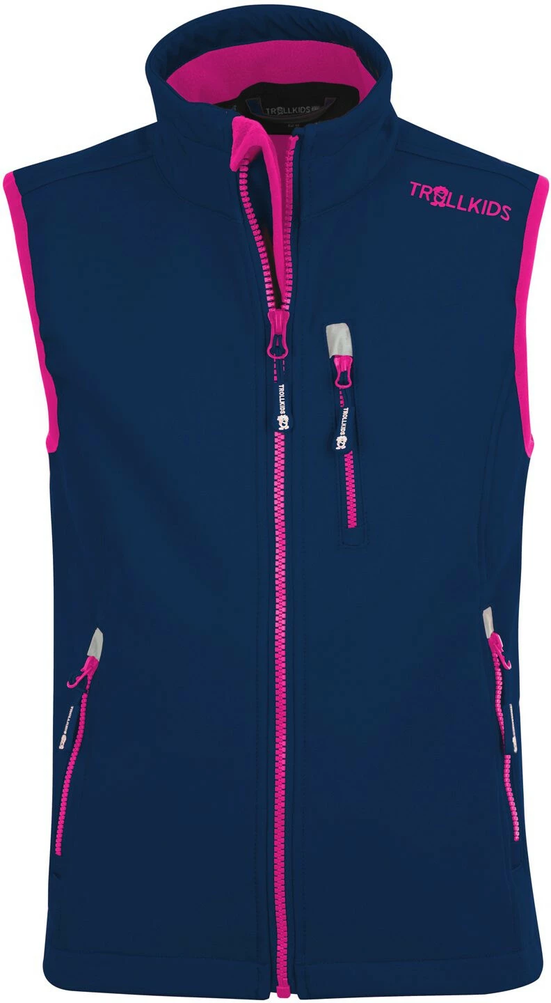 Het Kids Trollfjord Vest is een veelzijdig, waterafstotend en ademend softshell vest voor meisjes en jongens. Het is gevoerd met warme fleece en heeft twee heupzakken met rits en een borstzak met rits.